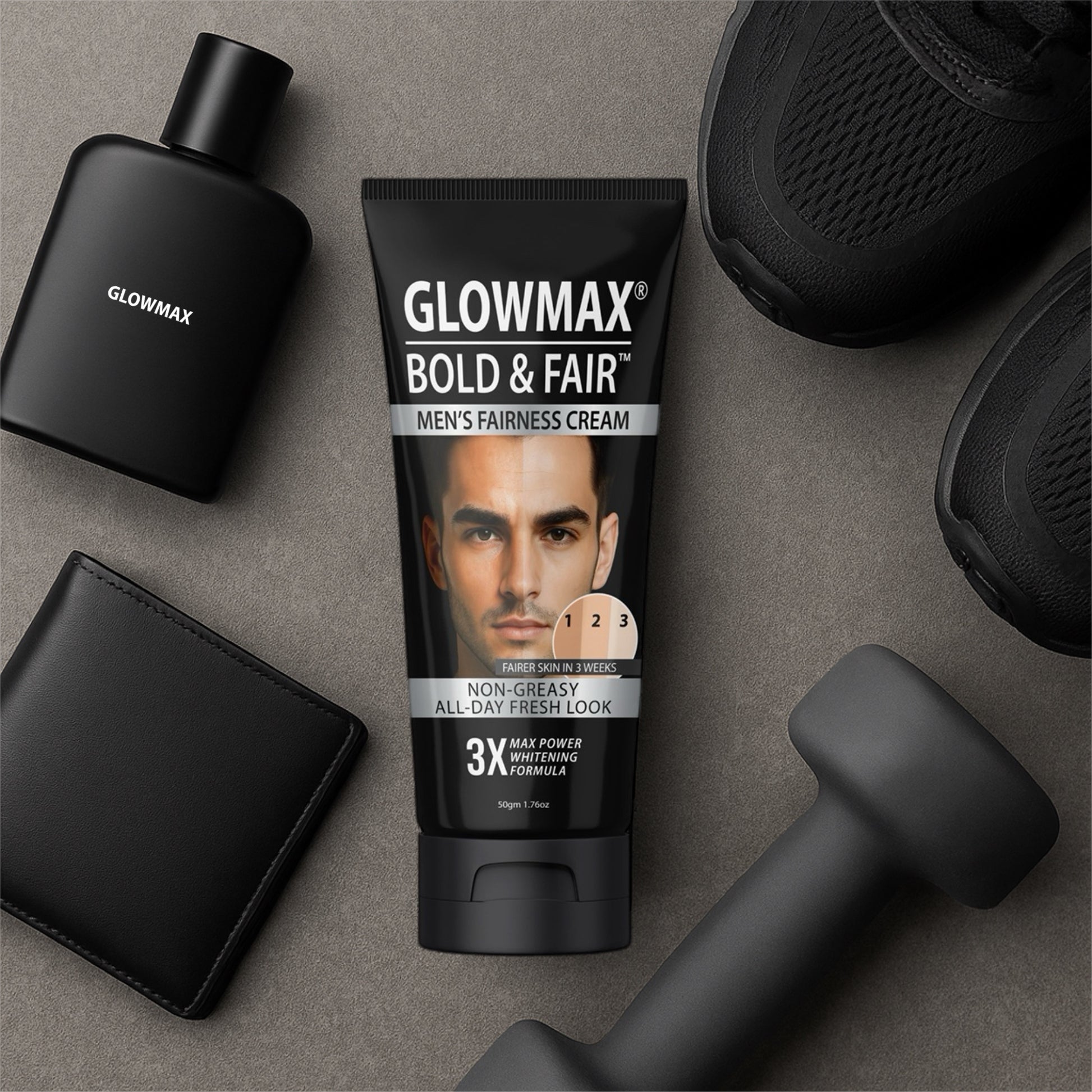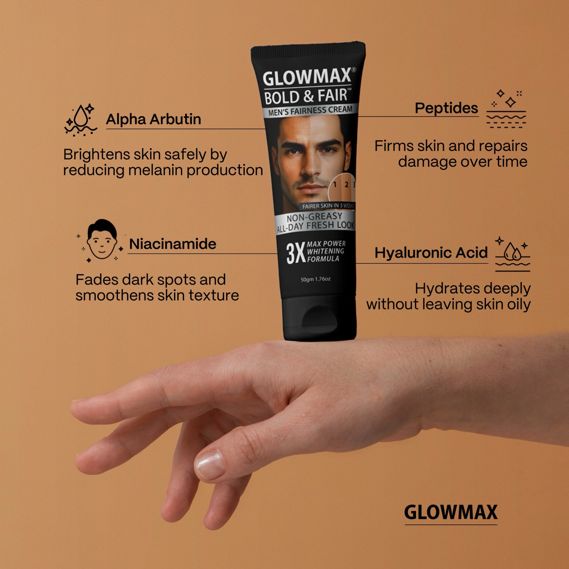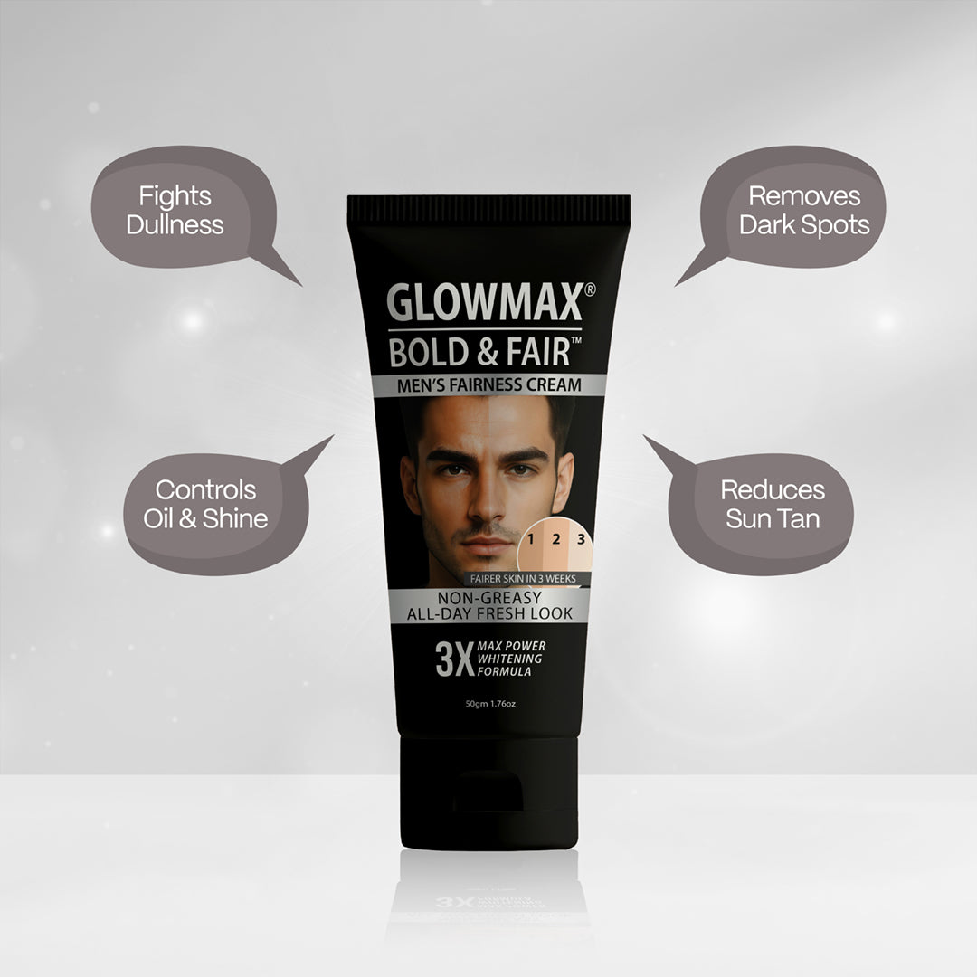 GlowMax BOLD & FAIR is formulated specifically for male skin types that are exposed to sun, pollution, and sweat. Our 3X Max Power Whitening Formula penetrates deeply to inhibit melanin, restore clarity, and keep your skin fresh all day long. Visible fairness starts appearing in as little as 7 days.
